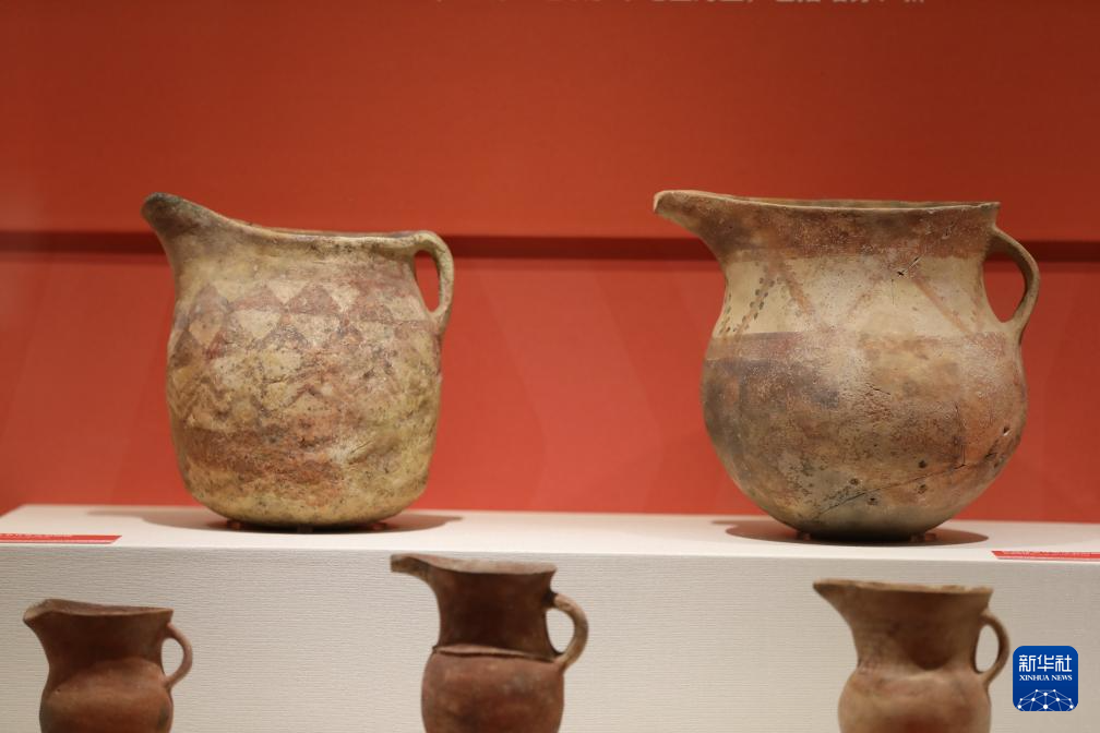 这是在新疆地区出土的方格纹单耳带流彩陶罐(上左)、折线纹单耳带流彩陶罐(上右)。新华社记者 张智敏 摄