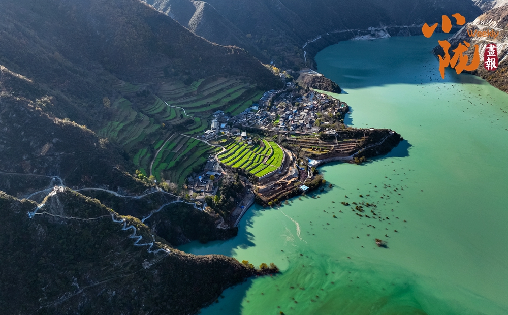 和煦的阳光倾洒而下,白龙江凝结的冰面宛如一块巨大的天然翡翠,温润而晶莹。它并非孤立存在,而是以一种宁静而包容的姿态,温柔地环绕着、守护着岸上那些升起炊烟的村舍。