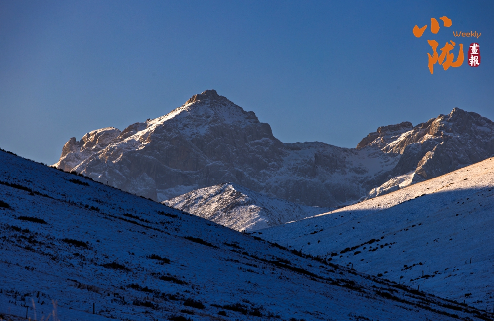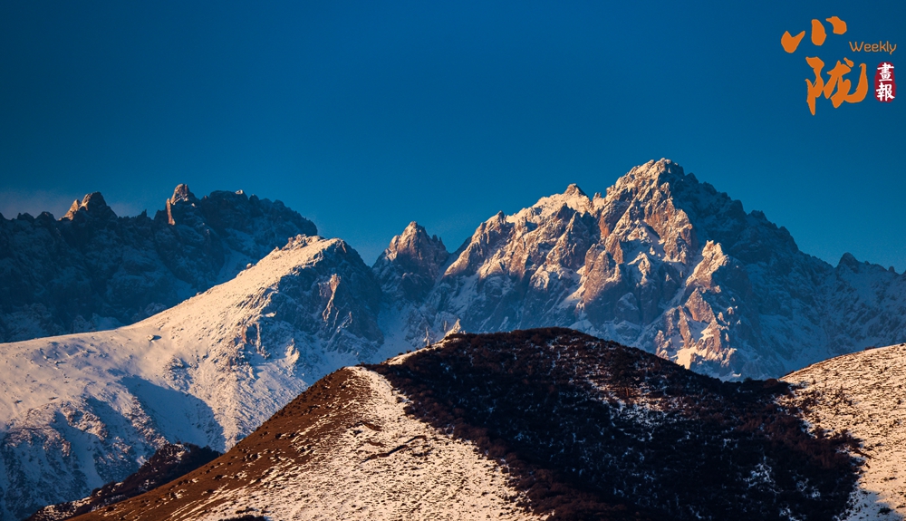 霞光沿着陡峭的山体徐徐蔓延,把寒光凛凛的积雪晕染成温厚的琥珀色泽。天穹是沉静的湛蓝,雪山则如一件精心锻造的鎏金艺术品悬于其间——山腰以下浸入苍茫暮色,峰巅之上仍燃烧着最后的辉煌。