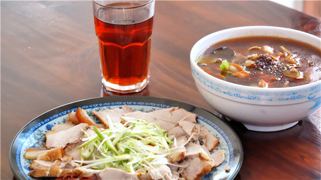 “三套车”是必尝的招牌,一碗行面、一盘卤肉、一杯茯茶,三者搭配“缺一不可”。行面筋道爽滑,卤肉肥而不腻,茯茶解腻暖胃,一口面一口肉,再啜一口茶,是凉州人最得意的待客之餐。