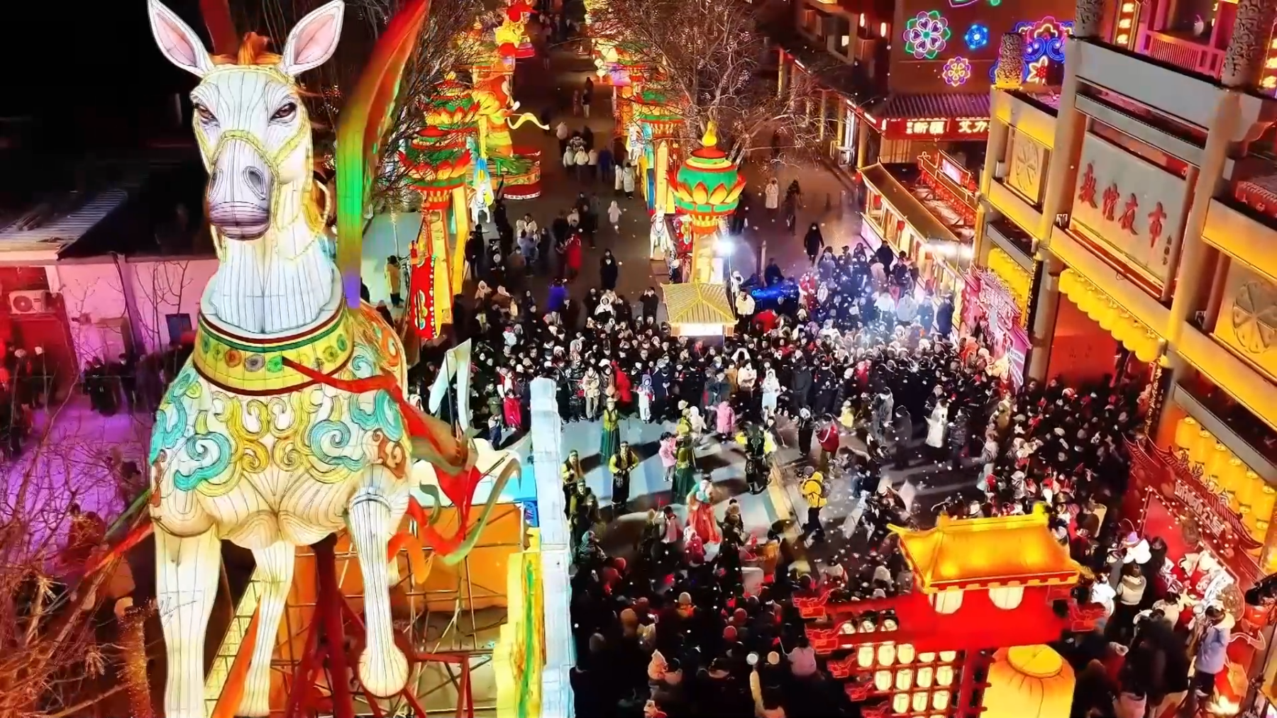 随着春节脚步临近,敦煌城区彩灯高悬、灯火璀璨,各类主题花灯次第点亮。敦煌灯会深度融入飞天、九色鹿、三兔共耳、反弹琵琶等经典敦煌文化元素,将千年壁画艺术与现代灯光技艺相结合,打造出造型精美、意境悠远的灯组景观。夜幕降临,华灯初上,古郡敦煌被装点得如梦似幻,一步一景皆年味,一眼一画尽敦煌。