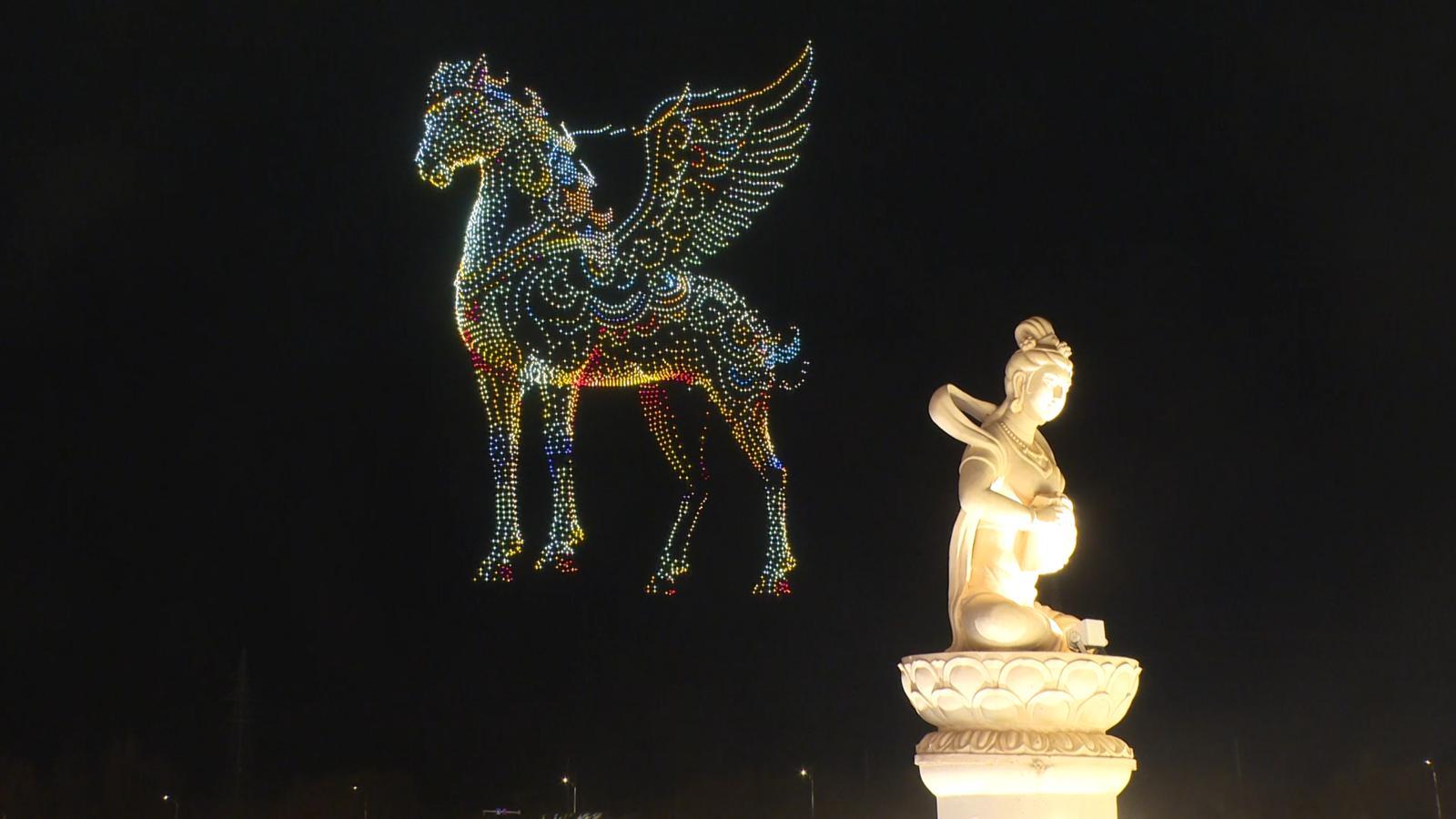 夜幕降临,星河璀璨。随着光影矩阵升空,“中国年 敦煌行”鎏金大字率先点亮苍穹,向世界发出诚挚邀约。整场展演以敦煌文化为脉络,分篇章呈现经典意象与时代图景,将莫高窟、九色鹿、美人菩萨、张骞、翼马、团花藻井、祥云纹样等壁画元素一一“搬”上夜空,让千年壁画在星空下“活”起来。表演还融入敦煌高铁等现代符号,实现古丝路文明与新时代发展的时空呼应,内容兼具文化内涵与时代气息。