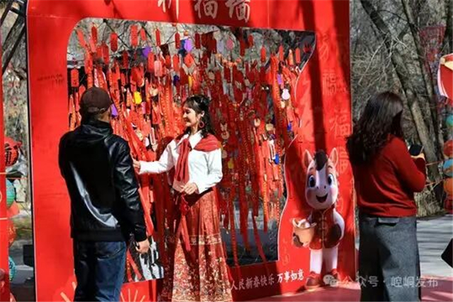 依托历史,柳湖公园被精心打造成一个宏大的“国风剧本游”现场。公园的“四门、两阁、三亭、两广场、一泉一码头”等十数个节点,被赋予了独特的文化剧本。东门以光影技术重现“古关崆峒”的巍峨;北门则设置了以马年生肖与“一马当先”为主题的打卡点,游客可抽取刻有“崆峒福”“马年顺”的祈福签,呼应着丙午马年的祥瑞。