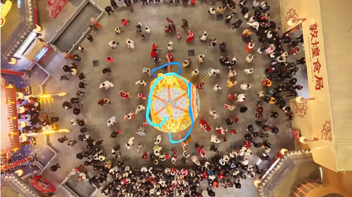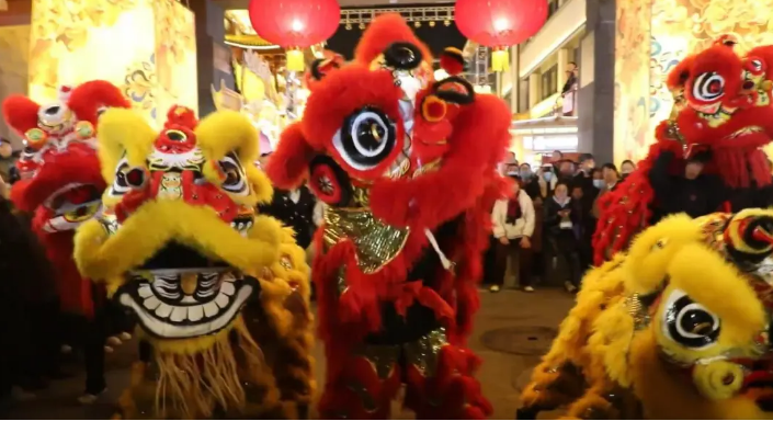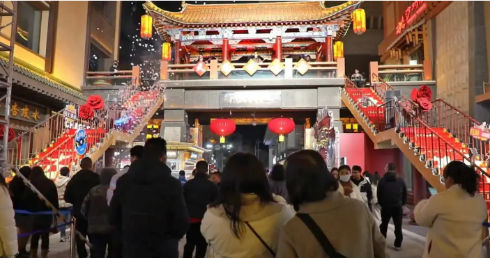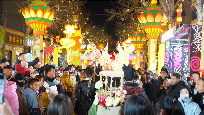敦煌食局以“福禄祈福·元宵团圆”为主题,市民游客围绕吉祥葫芦灯转圈祈福,现场暖意融融。龙腾狮跃民俗表演同步登场,铿锵锣鼓声中,瑞狮起舞,演员们动作矫健、神态灵动,将传统民俗的喜庆氛围演绎得淋漓尽致。同一时间,西域路“丝路市井夜卷巡游”同步启动,非遗展示、文创市集、特色NPC互动等元素融入巡游队伍,灯火映照下,仿佛一幅鲜活的丝路市井画卷徐徐展开。