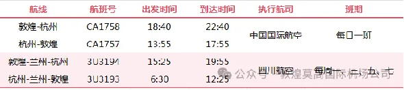 中国国际航空执飞直达航班,每日一班:杭州13:55起飞、17:55抵达敦煌,全程无经停,午后出发傍晚落地,方便旅客休整开启丝路之旅;敦煌18:40起飞、22:40抵达杭州,夜间返程兼顾日间游玩与商务需求,不影响次日行程。