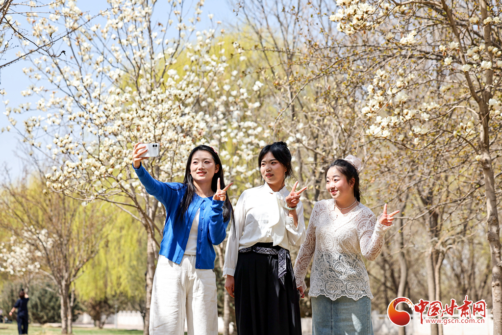 3月24日,市民在兰州市七里河区南宾河中路赏花拍照留影。
