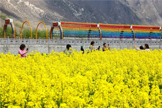在峰迭镇附近的油菜花观赏核心区,一幅由冬播油菜巧妙“绘制”而成的“藏乡江南 花开舟曲”巨幅图案格外引人注目。从高空俯瞰,八个大字在金色花海的映衬下清晰夺目,成为游客争相打卡的热门地标。不少游客举起手机、相机,或与家人合影留念,或拍摄短视频记录美好瞬间。