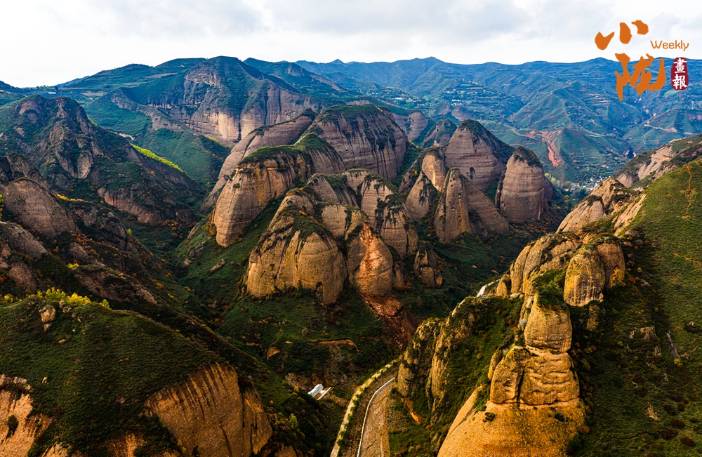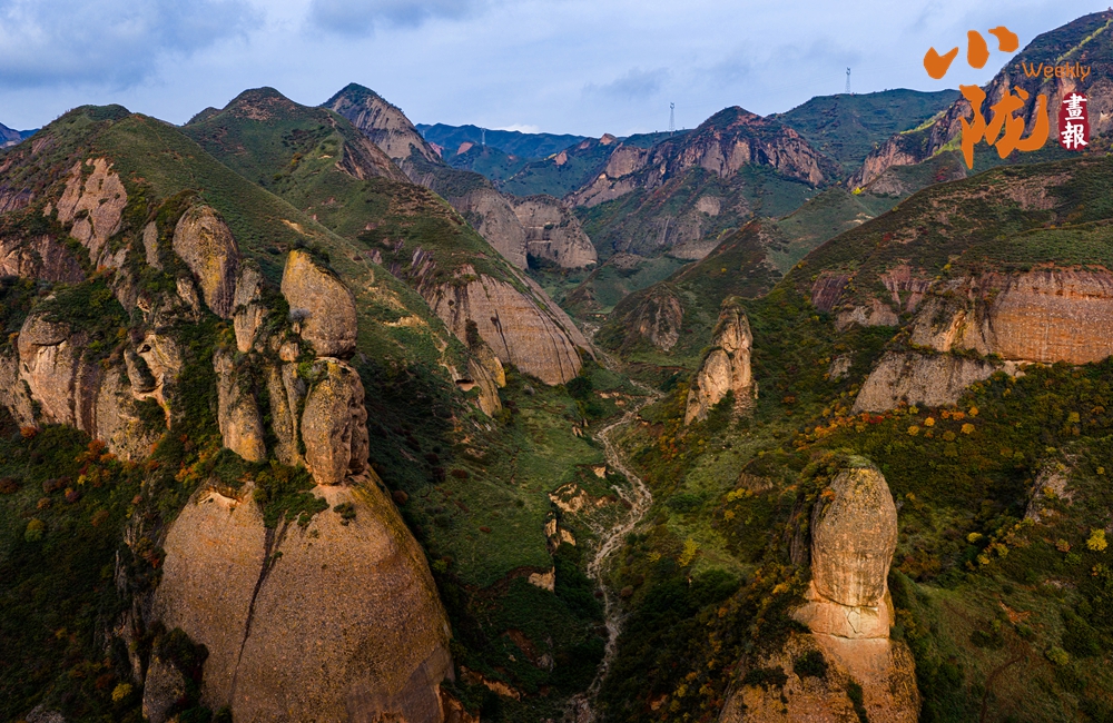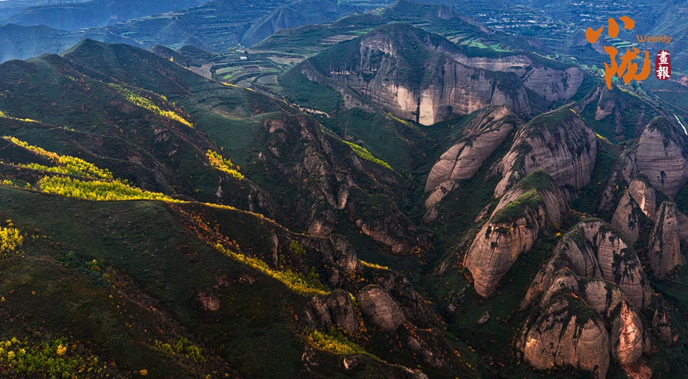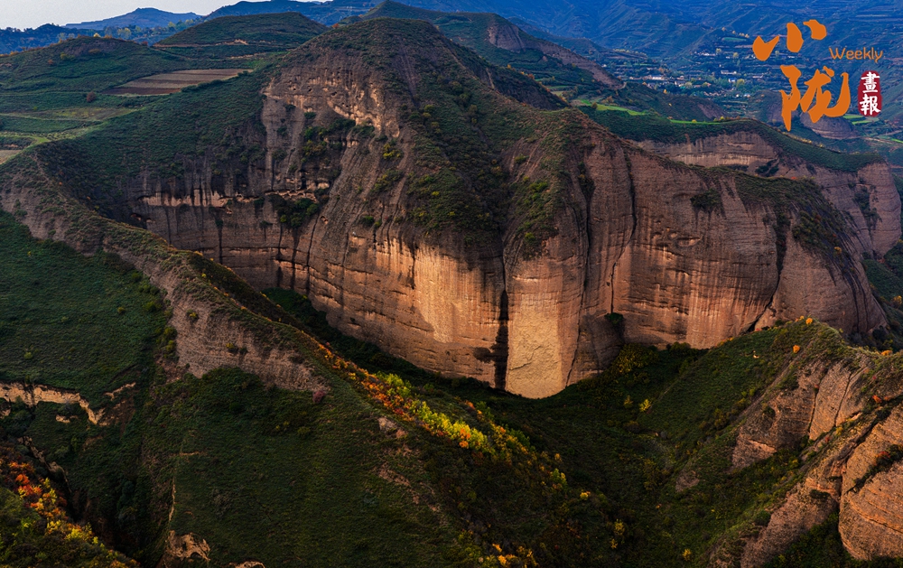 远远望去,山谷间、山岩上,一簇簇、一片片墨绿色草丛,将丹霞的红、初冬的彩、山体的褐轻轻晕染,构成一幅美丽的冬日美景。