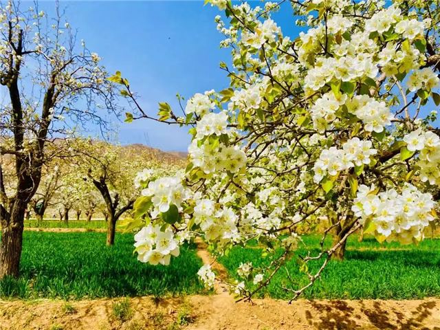4月中旬,千亩梨园迎来一年中最动人的时节。梨花竞相绽放,如云似雪,层层叠叠铺展开来,仿佛一场无声的春雪落在了枝头。这里的梨树多有年头,粗壮的树干挂满梨花,抬头仰观,洁白的花瓣在蓝天映衬下如诗如画。树下金黄色的油菜花与绿油油的麦苗相互映衬,春风吹过,阵阵清香弥漫山野。