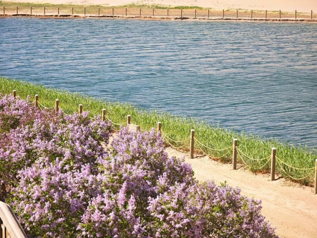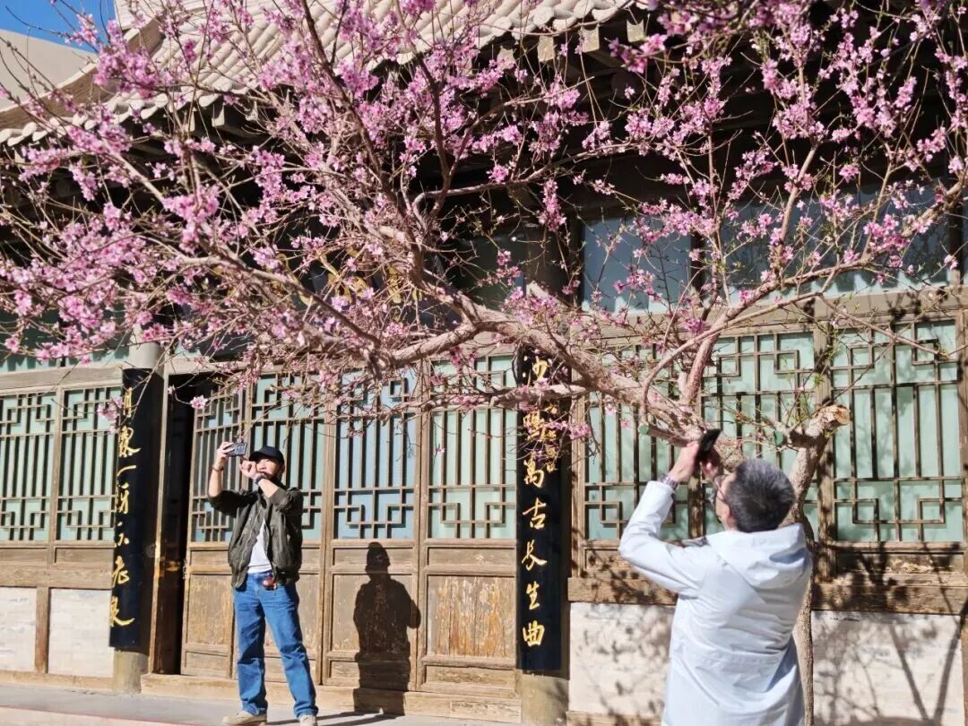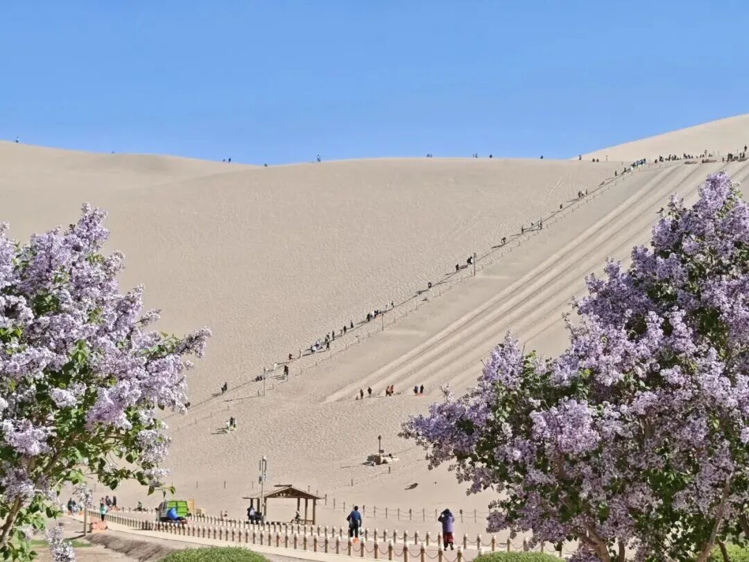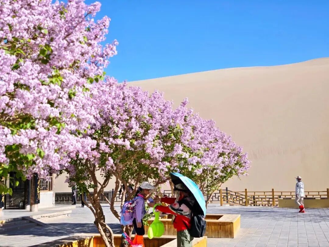当日下午,景区迎来了入园的最高峰,游客中心咨询不断,检票口前有序排队,爬山区的身影错落有致,月牙泉边笑语盈盈,景区处处人头攒动。春日的景区生机盎然,丁香、桃花、梨花竞相绽放、争奇斗艳,娇艳的花朵与苍茫大漠相映成趣,引得游客纷纷驻足赞叹,举起相机定格这春日美景。