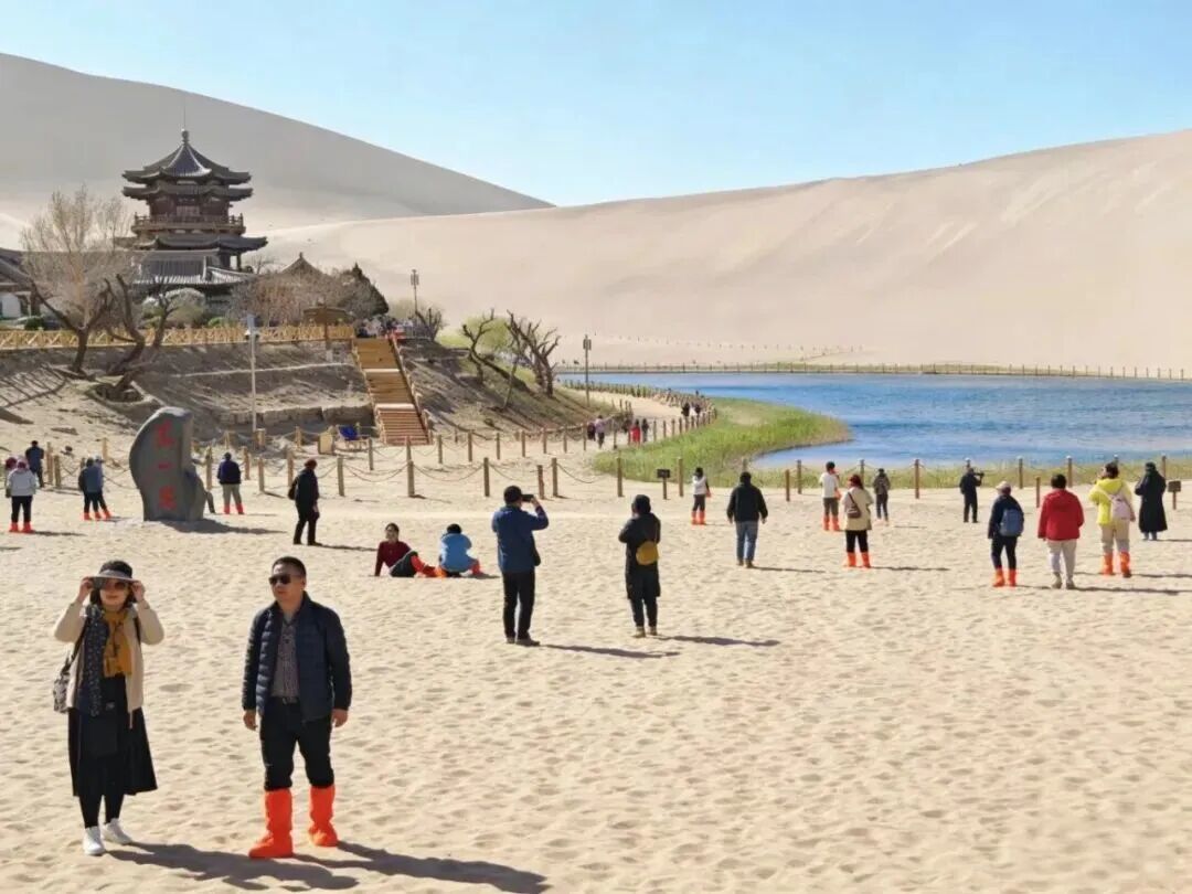 4月5日,正值清明小长假第二天,蔚蓝天空下,清新空气伴着轻柔微风,正是踏青出游的绝佳时节,敦煌市鸣沙山月牙泉景区迎来客流高峰。作为河西走廊上一颗璀璨明珠,景区独有的大漠雄浑壮阔与月牙泉温婉灵秀,成为大家假期出游的首选之地,大漠景色间,处处洋溢着热烈而温馨的游览氛围。