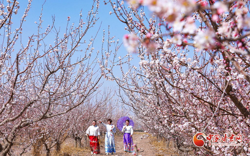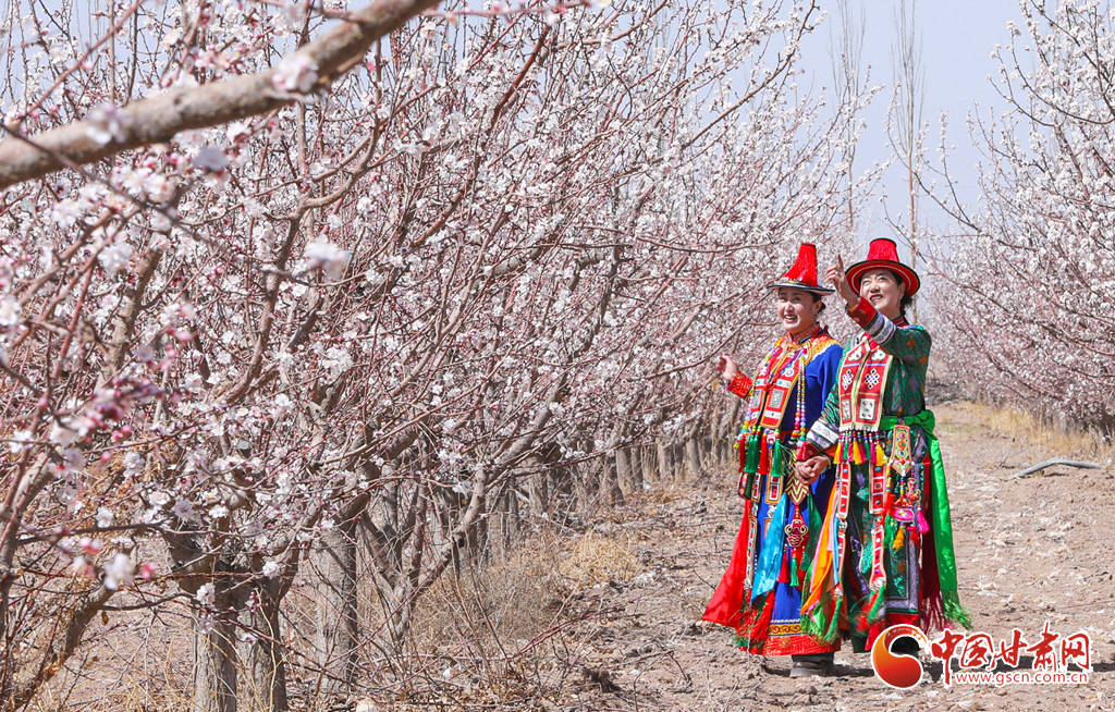 裕固族游客在千亩杏园种植基地里赏花