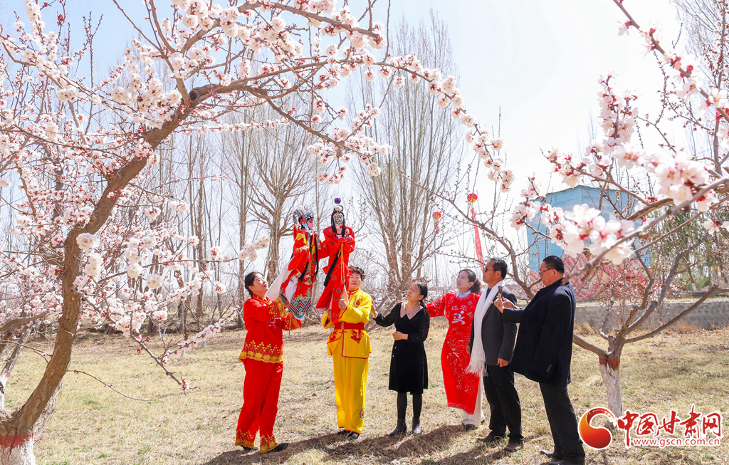 市民、游客在千亩杏园种植基地里观赏非遗杖头木偶戏