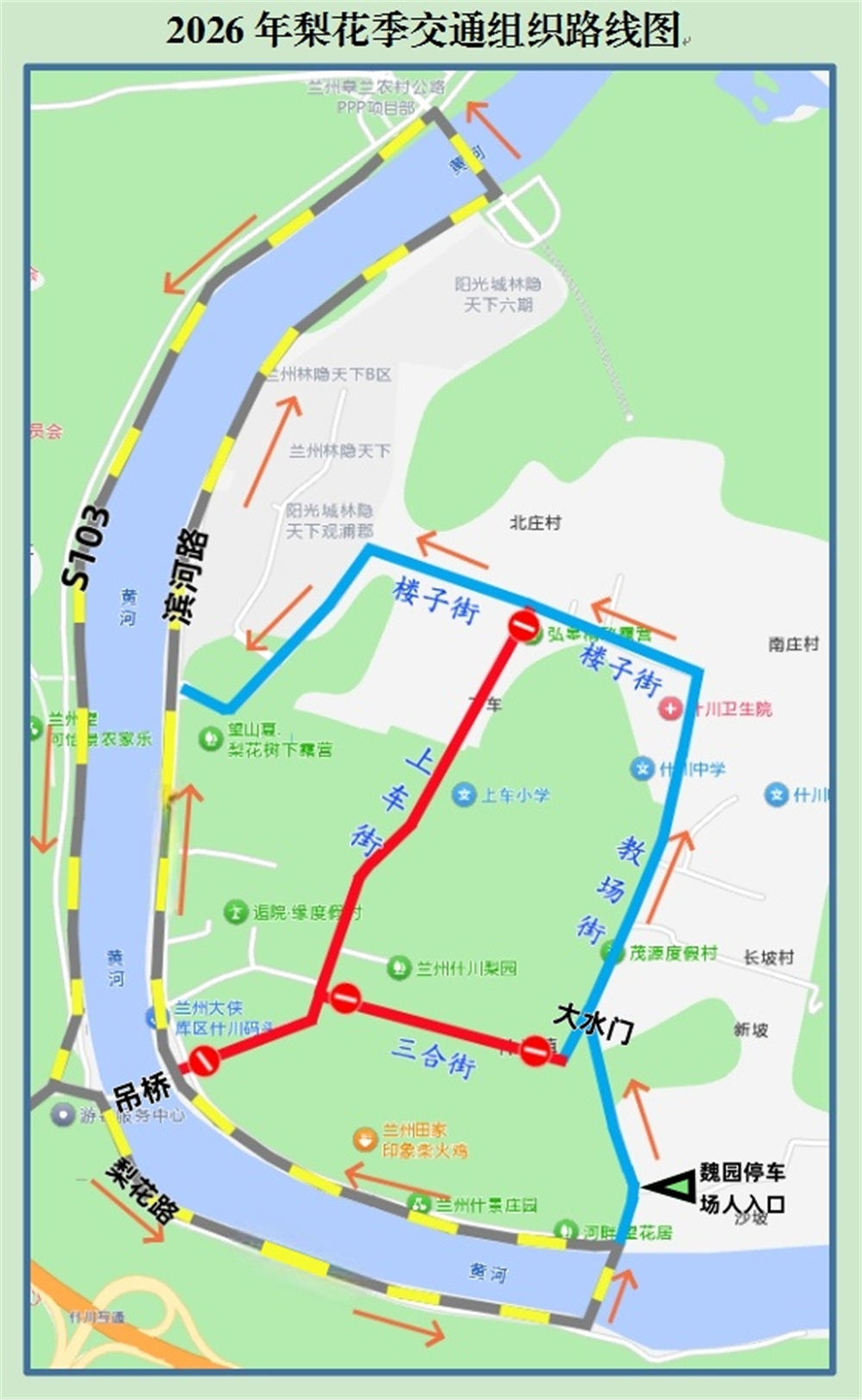 外循环:所有车辆统一沿梨花路进入滨河路,经黄河大桥沿S103驶出景区,形成闭环循环。平峰时段严格按照循环路线通行,禁止逆行、随意掉头;根据流量变化,可采取“可变车道”模式,所有车辆可沿S103和梨花路出入什川古梨园。