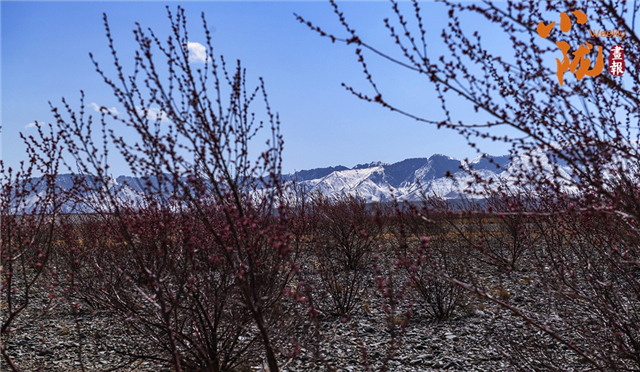 覆雪的寿鹿山静立天际,澄澈蓝天为底,近处枝头的杏花苞攒着粉紫的春意,待风一吹便要次第舒展,在苍茫的原野间晕开鲜活的春日序章。