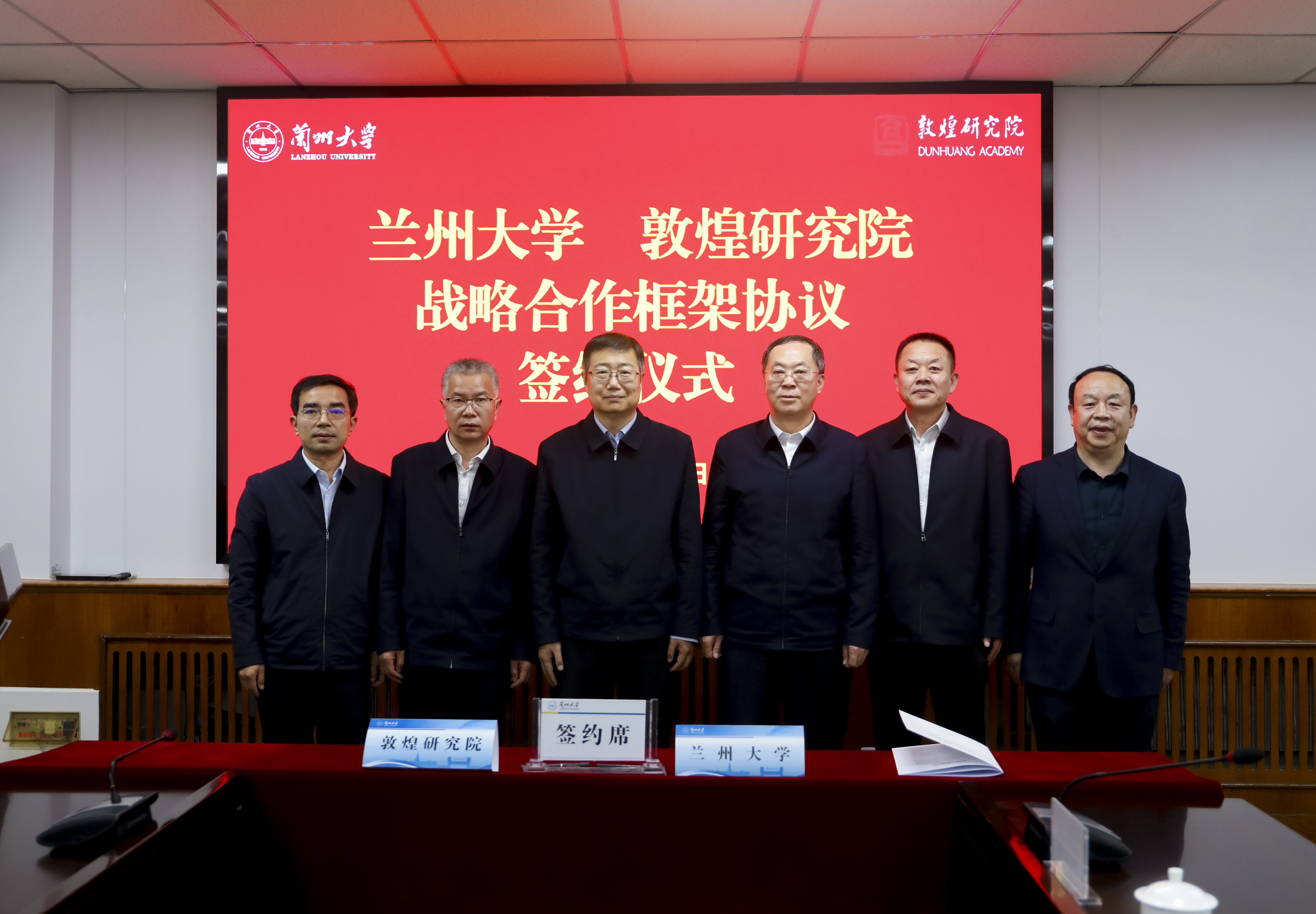 在兰州大学校长、中国工程院院士杨勇平,敦煌研究院党委书记程亮,敦煌研究院院长郭青林,兰州大学校长助理李永春的共同见证下,兰州大学副校长沙勇忠与敦煌研究院副院长赵林毅分别代表双方签署战略合作框架协议。
