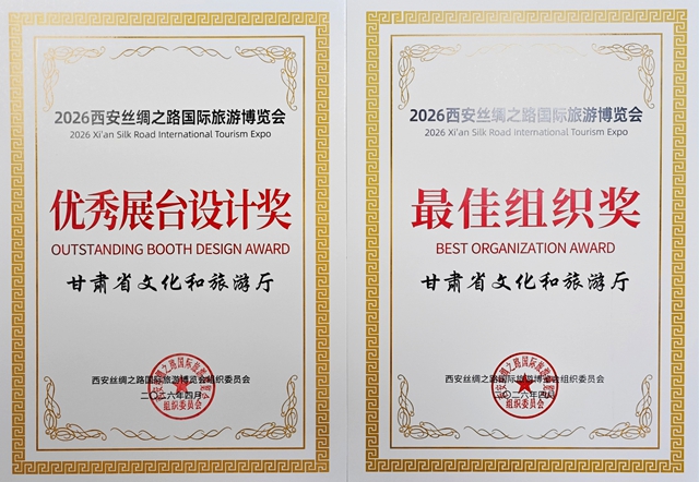 4月19日,2026西安丝绸之路国际旅游博览会在西安国际会展中心圆满落幕。甘肃省文化和旅游厅以“交响丝路·如意甘肃”为主题打造的沉浸式文旅展厅,凭借出色的组织统筹创意设计与丰富展陈,一举荣获“最佳组织奖”与“优秀展台设计奖”两项大奖。