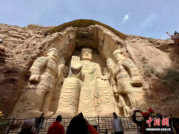 4月22日,甘肃武威,台湾旅行商参观“中国石窟鼻祖”天梯山石窟,感受精湛的古代雕刻与绘画艺术。4月22日至28日,随着丝路游升温,台湾旅行商一行走进甘肃考察踩线,深入感悟丝路魅力,寻觅丝路文旅交流新机遇。图为台湾旅行商参观大佛雕塑。闫姣 摄