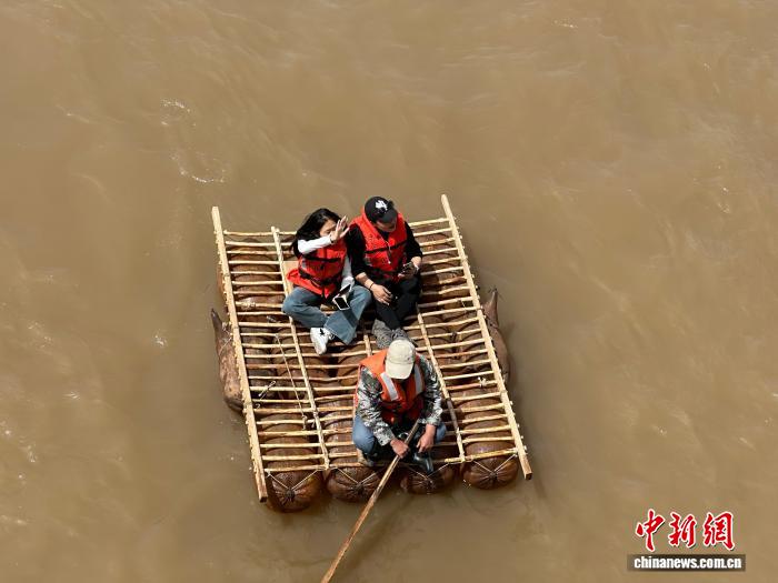 4月23日,气温渐暖的黄河兰州段迎来春游热潮,坐缆车、乘快艇、喂鸽子、体验羊皮筏子、乘坐黄河巴士等一系列黄河春游项目吸引游客。图为游客乘坐羊皮筏子。冯志军 摄