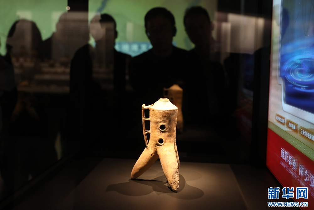 齐家文化博物馆展厅展出的带柄素陶鬶。新华网发(王生元 摄)