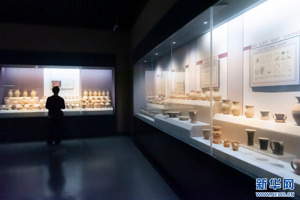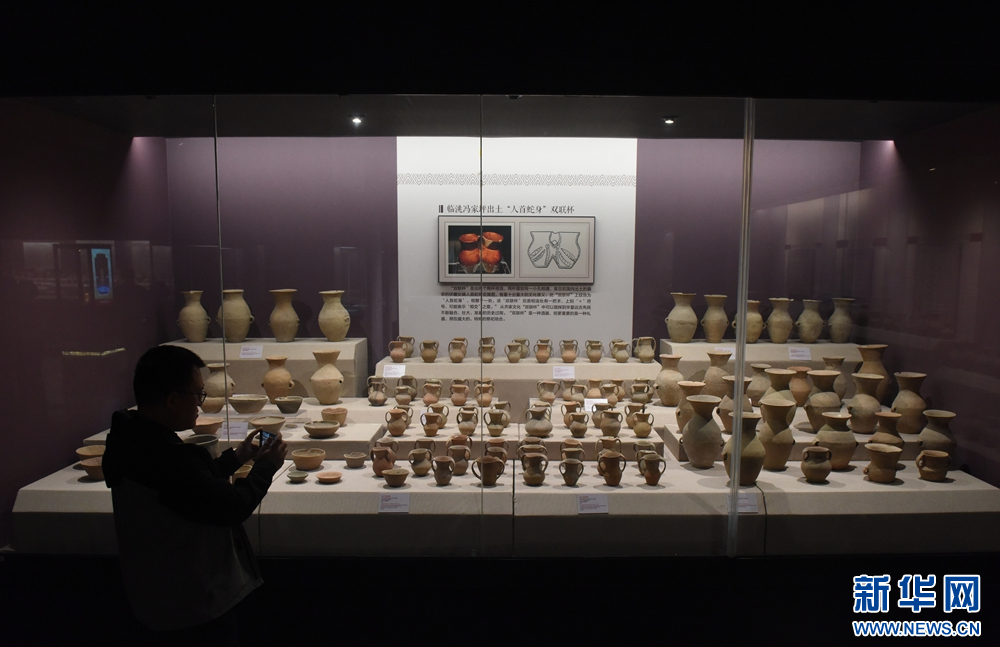 游客参观齐家文化博物馆内展出的陶罐。新华网发(史有东 摄)