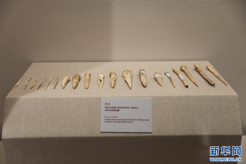齐家文化博物馆展厅展出的骨针。新华网发(王生元 摄)